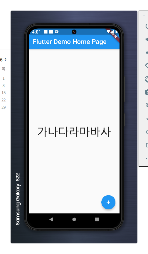 return Scaffold( appBar: AppBar( title: Text(widget.title), ), body: Center( child: Column( mainAxisAlignment: MainAxisAlignment.center, children: <Widget>[ Text( '가나다라마바사', textScaleFactor: 1.0, style: TextStyle(fontSize: 35), ), ], ), ), floatingActionButton: FloatingActionButton( onPressed: _incrementCounter, tooltip: 'Increment', child: const Icon(Icons.add), ), // This trailing comma makes auto-formatting nicer for build methods. );기존 프로젝트 생성 후 Text만 바꾼 코드다.